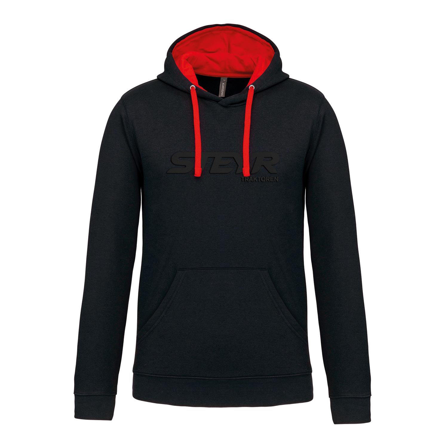 This black and red hoodie has an embossed Steyr logo print on the front and a graphic print on the back.