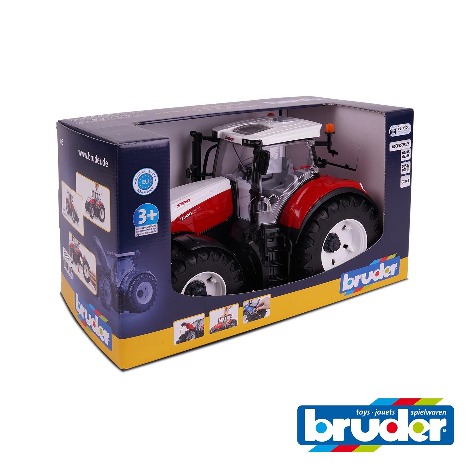 Scale model of the 6300 Terrus CVT tractors with drivers cab with opening engine bonnet and doors, automotive body with detachable front weight, tow coupling with height-adjustable lifting gear and receiver for front loader, chassis: off-road rear axle, steerable and off-road front axle, tread tyres. All BRUDER agricultural trailers and equipment are compatible with this tractor. Suitable from 3 years upwards for playing indoors and outdoors. Scale 1:16.