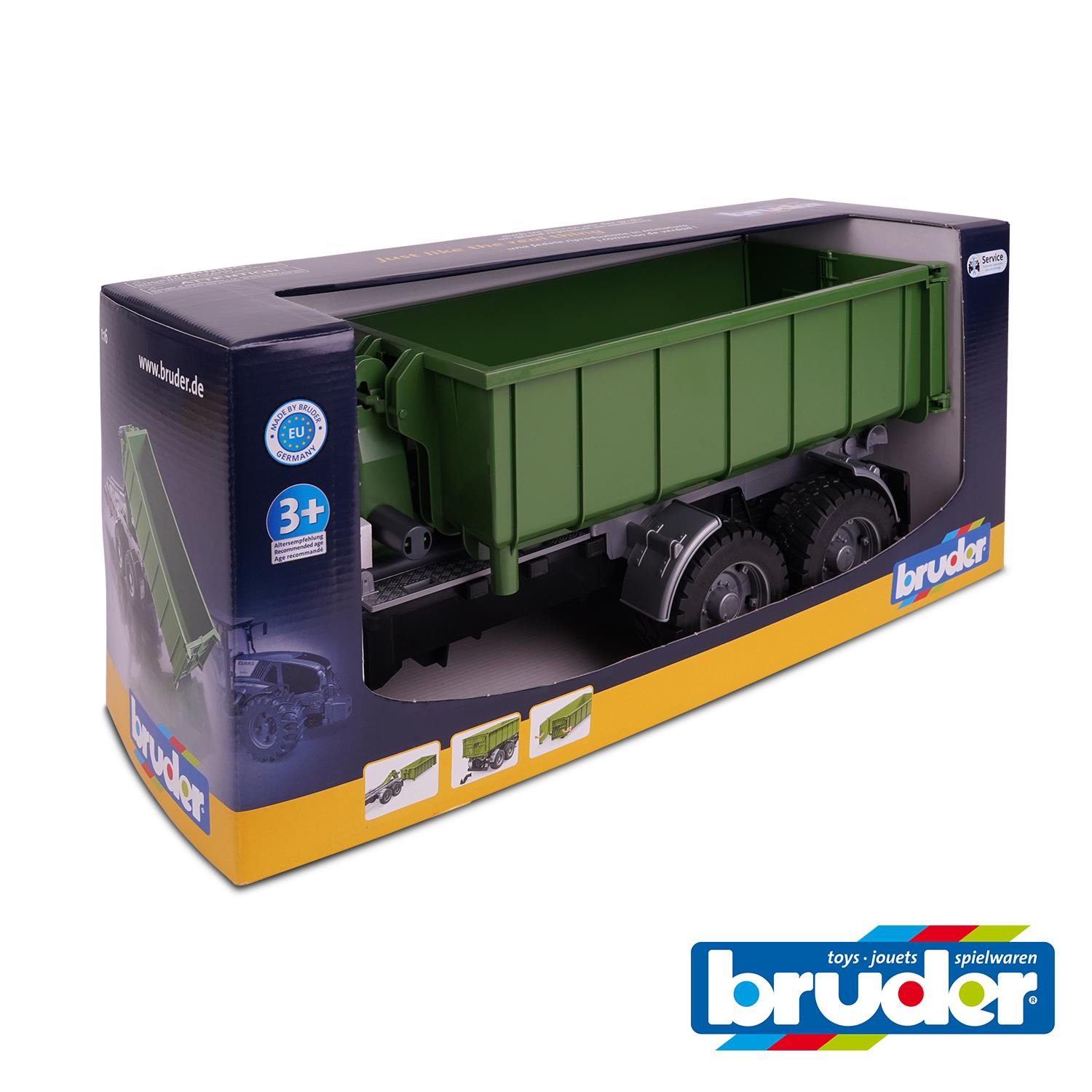 Roll-Off-Container trailers have become extraordinarily popular in contemporary agriculture. Their versatility is greatly valued and applied in any context as it can be used as a conventional tipper trailer and, if necessary, also for stationary filling. This multi-talent now enhances BRUDER’s agriculture themed world. Just like the real thing, it is possible to tip or fully drop off the unit. The two swing doors grant access to the cargo area. This toy features the universal coupling adapter to enable a host of combinations. All 2000 – 4000 series tractors perfectly match this great trailer.